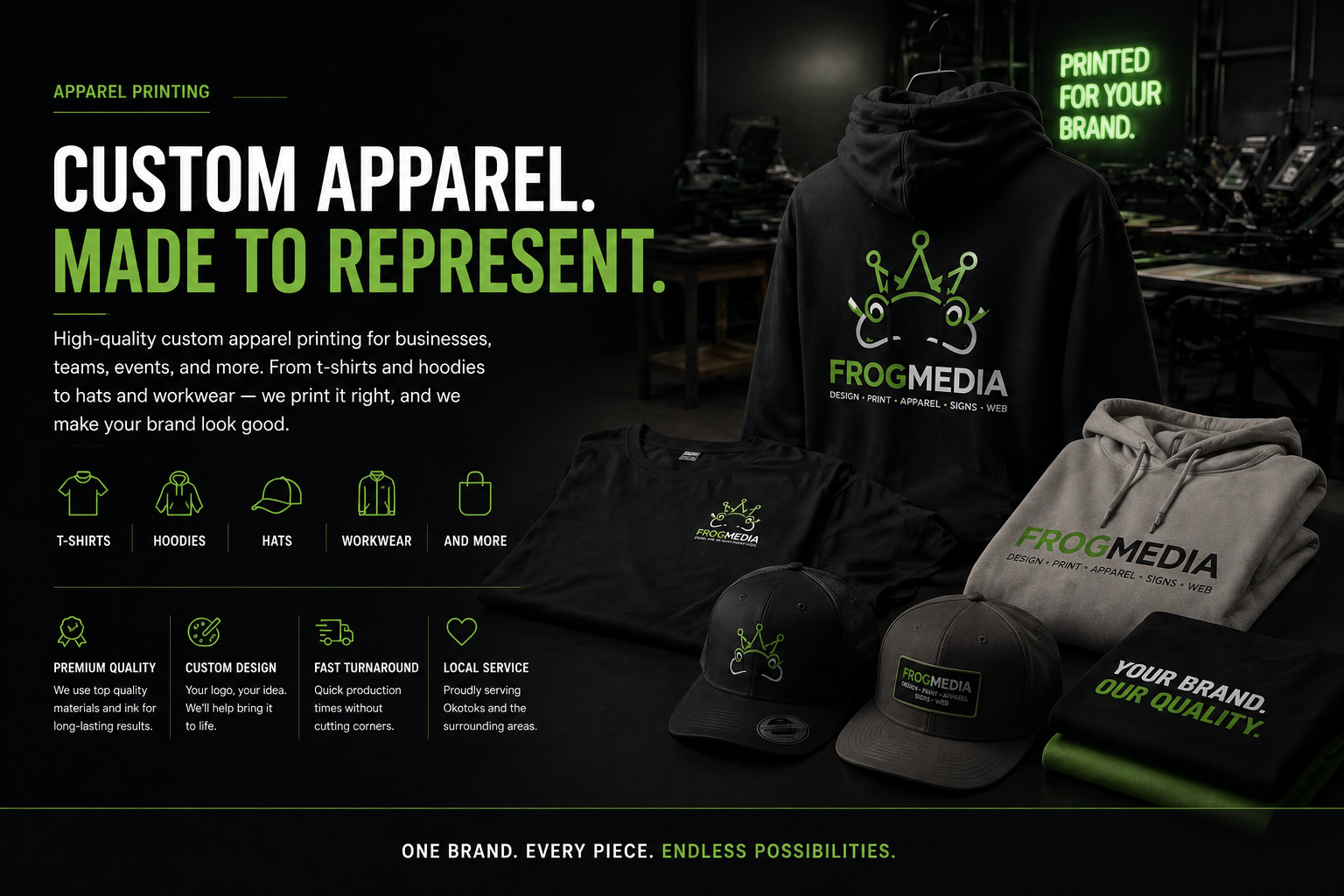 FrogMedia offers high-quality custom apparel printing in Okotoks for businesses, teams, events, and brands looking to stand out. From t-shirts and hoodies to hats and workwear, we produce clean, professional prints that represent your brand the right way. Whether you need a small run or larger order, we focus on quality, consistency, and fast turnaround times.