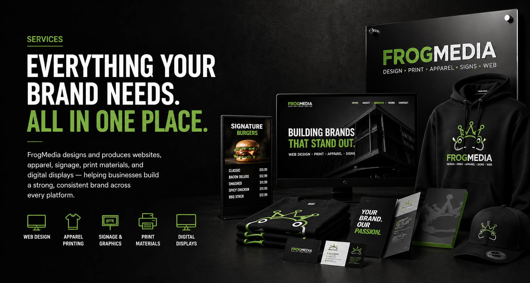 FrogMedia provides complete branding solutions for businesses in Okotoks and the surrounding areas. From professional website design and custom apparel printing to signage, print materials, and digital menu boards, we help businesses create a strong and consistent brand across every platform. Whether you’re launching a new business or upgrading your current look, our goal is to deliver high-quality design and production that gets results.